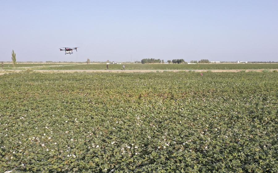 在新疆尉犁縣興平鎮(zhèn)達(dá)西村一處高標(biāo)準(zhǔn)農(nóng)田,種植戶用無人機(jī)噴灑脫葉劑(2022年9月20日攝,無人機(jī)照片)。新華社發(fā)(汪志鵬 攝)