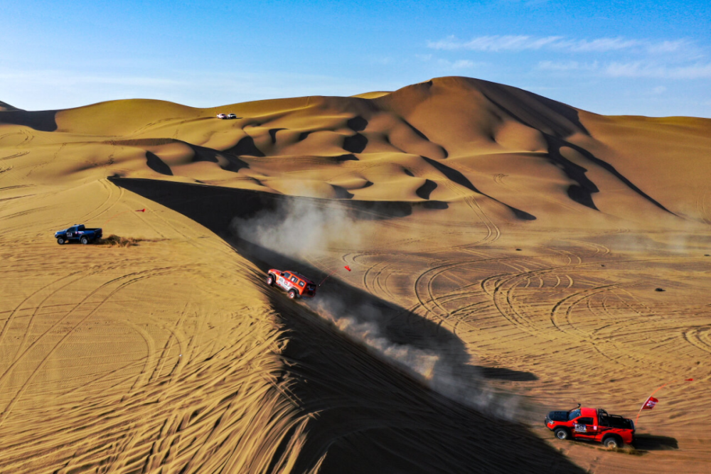 賽車(chē)在庫(kù)木塔格沙漠里馳騁(無(wú)人機(jī)照片)。周鵬 攝