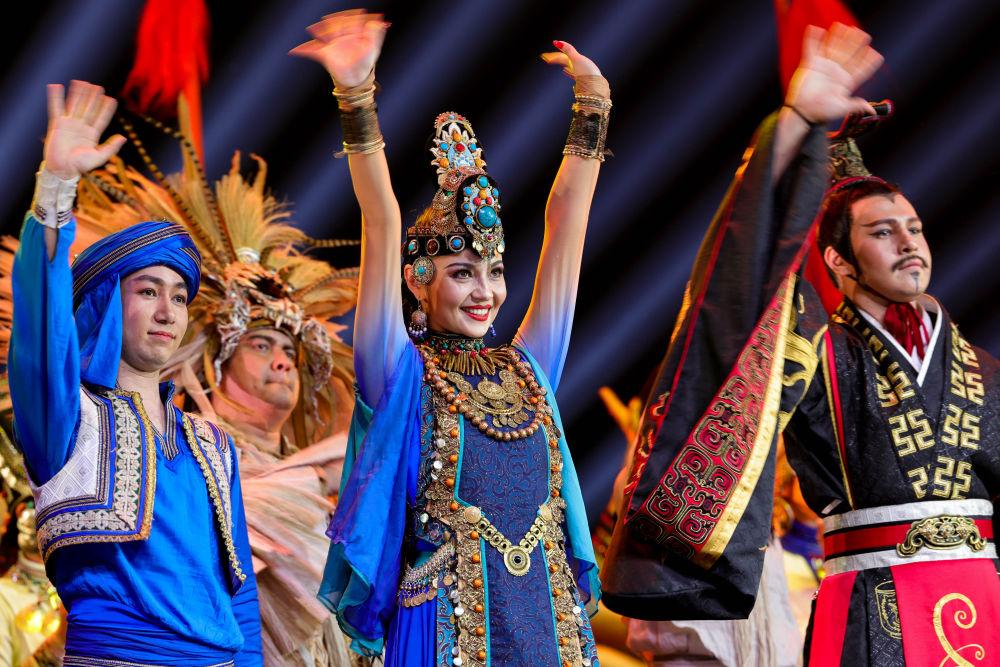 2022年4月22日,在新疆藝術(shù)劇院木卡姆藝術(shù)團(tuán)劇場,舞蹈演員馬依熱·艾買提江(中)在舞劇《張騫》演出后向觀眾致謝。馬依熱來自烏魯木齊,11歲時前往北京跟隨專業(yè)舞蹈老師學(xué)習(xí),學(xué)成后回到家鄉(xiāng),成為新疆藝術(shù)劇院歌舞團(tuán)的一名舞蹈演員?!靶陆母栉枋侵腥A傳統(tǒng)文化的一部分,是用來歌頌美好生活的。希望我的舞蹈,能增進(jìn)各民族間的感情,促進(jìn)文化交融?!瘪R依熱說。