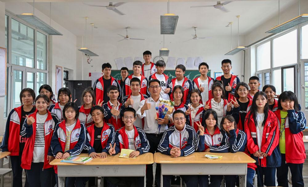 2024年9月10日,在新疆阿拉爾職業(yè)技術(shù)學(xué)校,援疆教師李斌傲(中)和23級電商班的學(xué)生合影?!?5后”年輕教師李斌傲是第十一批浙江臺州到新疆阿拉爾職業(yè)技術(shù)學(xué)校援疆教師中的一員,負(fù)責(zé)教授電子商務(wù)專業(yè)課程。他在學(xué)校主導(dǎo)籌建了電商實訓(xùn)室,還帶了4個新入職的教師當(dāng)徒弟?!芭嘤?xùn)好本地教師,就是打造一支帶不走的隊伍?!崩畋蟀琳f。