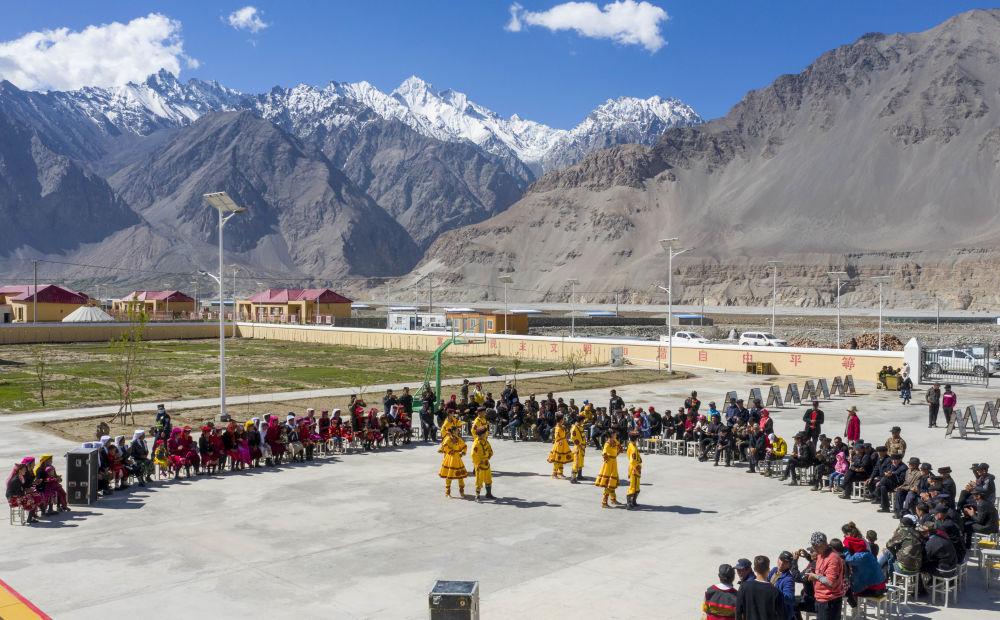 2020年6月6日,新疆塔什庫爾干塔吉克自治縣文工團(tuán)演員在達(dá)布達(dá)爾鄉(xiāng)的一個山村為村民表演舞蹈節(jié)目(無人機(jī)照片)。塔縣文工團(tuán)成立于1956年,現(xiàn)有工作人員100余人,是活躍于新疆帕米爾高原上的“文藝輕騎兵”。在自然環(huán)境嚴(yán)酷的高原,塔縣文工團(tuán)演員們常年堅持送文化進(jìn)山村、到牧場,宣講惠民政策,用文藝演出豐富村民的精神文化生活。