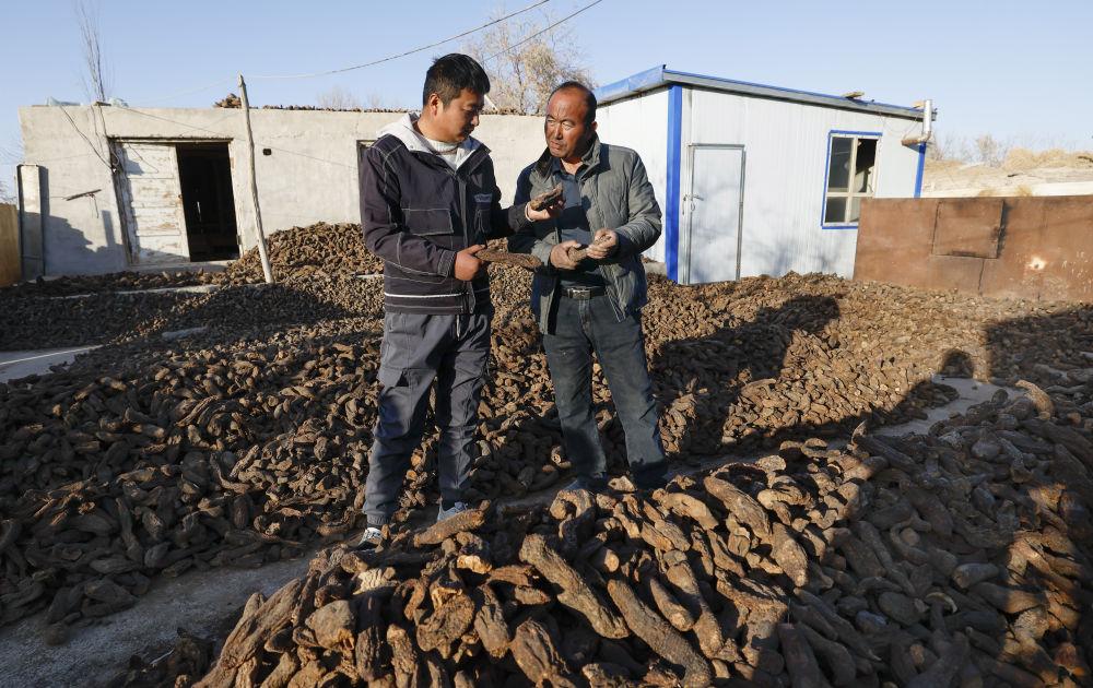 2024年12月4日,新疆民豐縣尼雅鎮(zhèn)甫甫克村村民麥麥提(右)同前來收購大蕓的商戶交流。自20世紀(jì)末新疆全面開展防風(fēng)治沙工程并大力推進(jìn)沙產(chǎn)業(yè)以來,麥麥提從在合作社挖大蕓賺工錢,到后來主動學(xué)習(xí)大蕓種植技術(shù)并創(chuàng)業(yè),一路走來小有收獲。2018年,他承包了10畝沙地種紅柳、大蕓。紅柳茁壯成長,大蕓產(chǎn)量頗豐,麥麥提年收入超過5萬元。