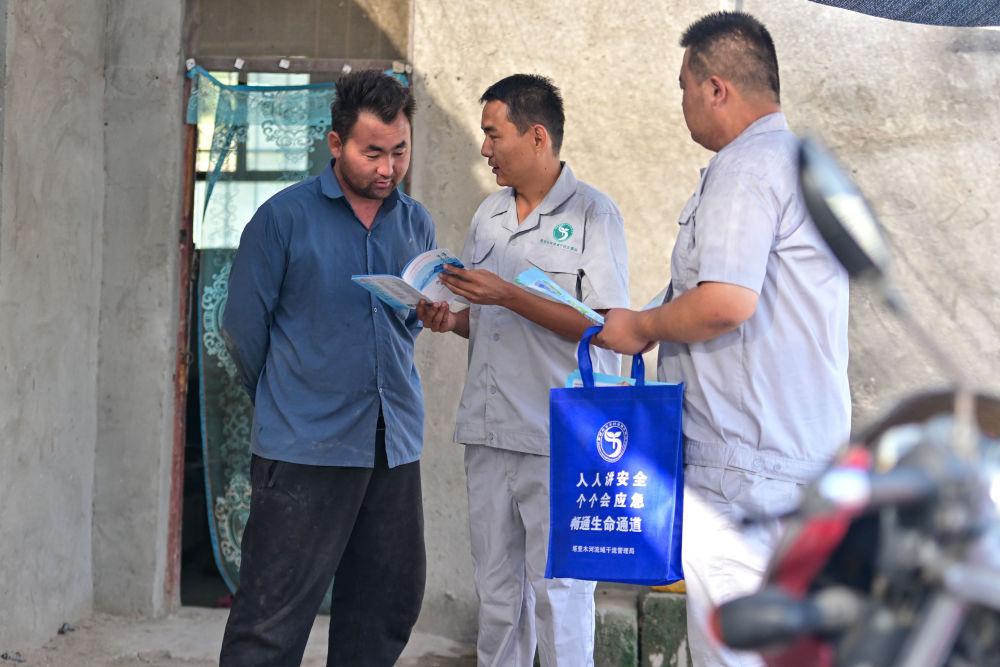 2024年8月13日,在新疆塔里木河尉犁段,新疆塔里木河流域干流管理局烏斯?jié)M管理站副站長才登巴(中)與同事宋志偉入戶宣傳法律法規(guī)。