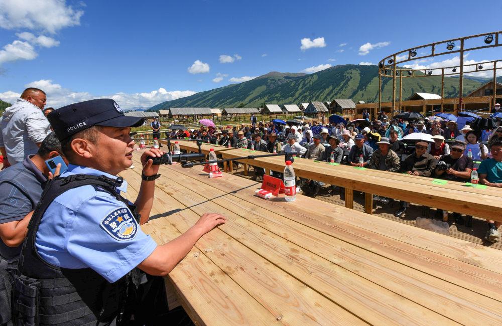 2024年7月22日,在新疆阿勒泰地區(qū)布爾津縣禾木哈納斯蒙古族鄉(xiāng)哈納斯村,喀納斯邊境派出所民警在村民大會上給村民宣講邊境法律法規(guī)。近年來,喀納斯邊境派出所通過“警村企黨支部聯(lián)合工作站”模式,聯(lián)合當(dāng)?shù)厝罕姟⒕皡^(qū)一起解決游客難題,大大提升了警務(wù)效率,逐步形成了“景中警 貼心人”的旅游警務(wù)品牌。