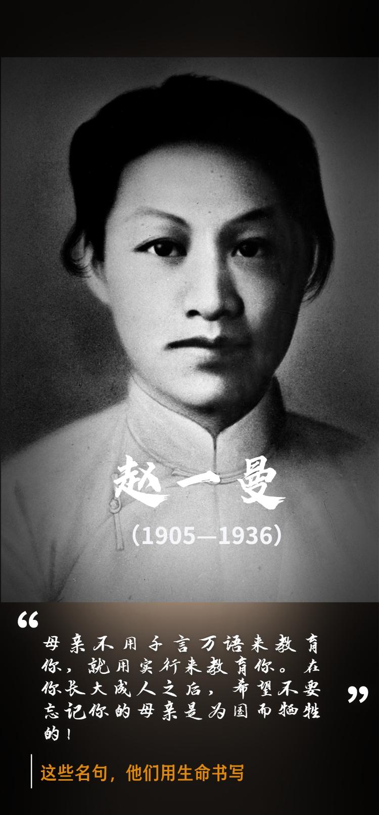 趙一曼,原名李坤泰,1905年10月25日出生在四川宜賓的一個(gè)地主家庭。1923年冬,趙一曼加入中國(guó)社會(huì)主義青年團(tuán)。1926年夏加入中國(guó)共產(chǎn)黨。 1935年秋,趙一曼任東北抗日聯(lián)軍第3軍1師2團(tuán)政治委員。11月間,第2團(tuán)被日偽軍圍困于一座山間。趙一曼為掩護(hù)部隊(duì)突圍,身負(fù)重傷,養(yǎng)傷期間被日軍發(fā)現(xiàn),戰(zhàn)斗中再度負(fù)傷,昏迷被俘。1936年8月2日,趙一曼壯烈犧牲,年僅31歲。