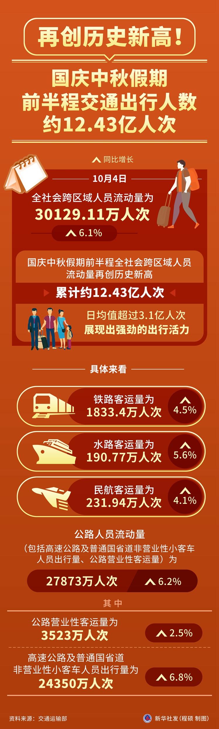 新華社北京10月5日電(記者葉昊鳴)記者5日從交通運(yùn)輸部獲悉,10月4日,全社會(huì)跨區(qū)域人員流動(dòng)量為30129.11萬人次,同比增長(zhǎng)6.1%。國(guó)慶中秋假期前半程全社會(huì)跨區(qū)域人員流動(dòng)量再創(chuàng)歷史新高,累計(jì)約12.43億人次,日均值超過3.1億人次,展現(xiàn)出強(qiáng)勁的出行活力。