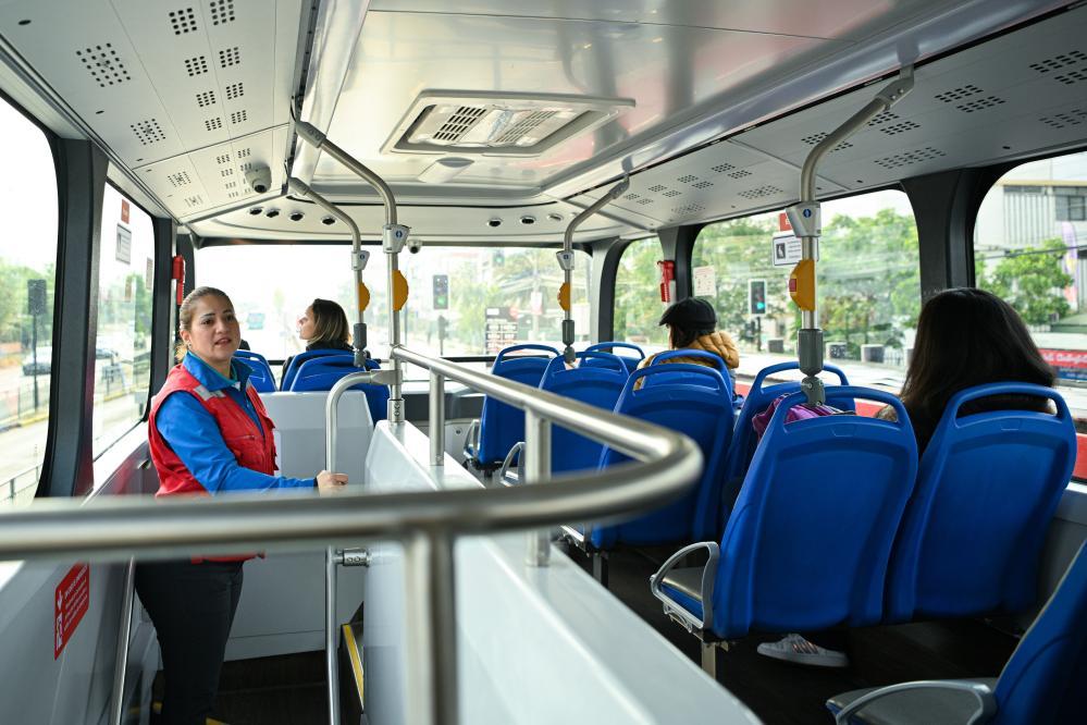 2023年11月2日,在智利首都圣地亞哥,一輛520路新能源公交車(chē)的工作人員在車(chē)內(nèi)巡視。智利圣地亞哥520路公交路線(xiàn)是為2023泛美運(yùn)動(dòng)會(huì)特別開(kāi)設(shè)的。新華社記者辛悅衛(wèi)攝