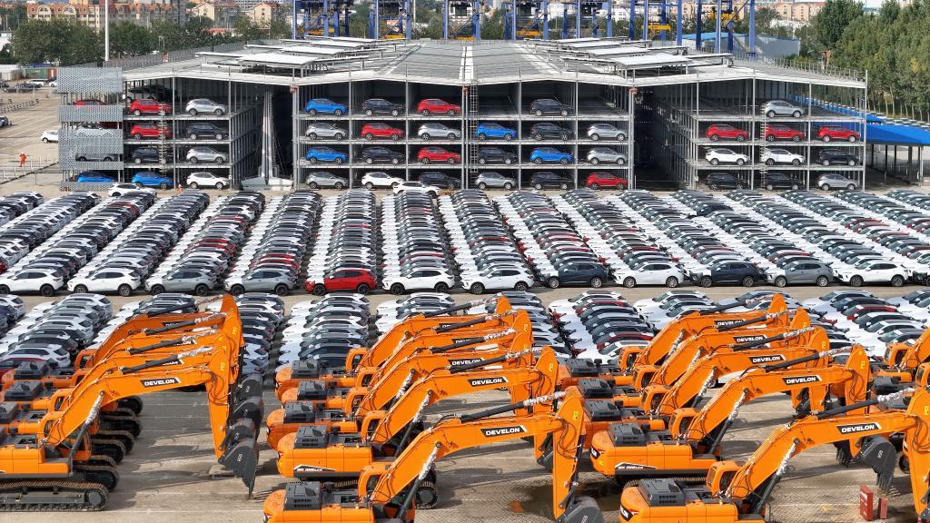10月20日,國(guó)產(chǎn)汽車(chē)和工程機(jī)械在山東港口煙臺(tái)港集結(jié)等待裝船出口(無(wú)人機(jī)照片)。新華社發(fā)(唐克攝)