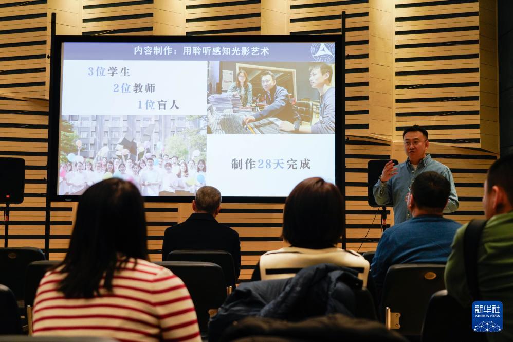 教師志愿者付海鉦在中國傳媒大學(xué)“光明影院”無障礙信息傳播實(shí)驗室為媒體介紹光明影院項目(12月1日攝)。新華社記者 謝晗 攝