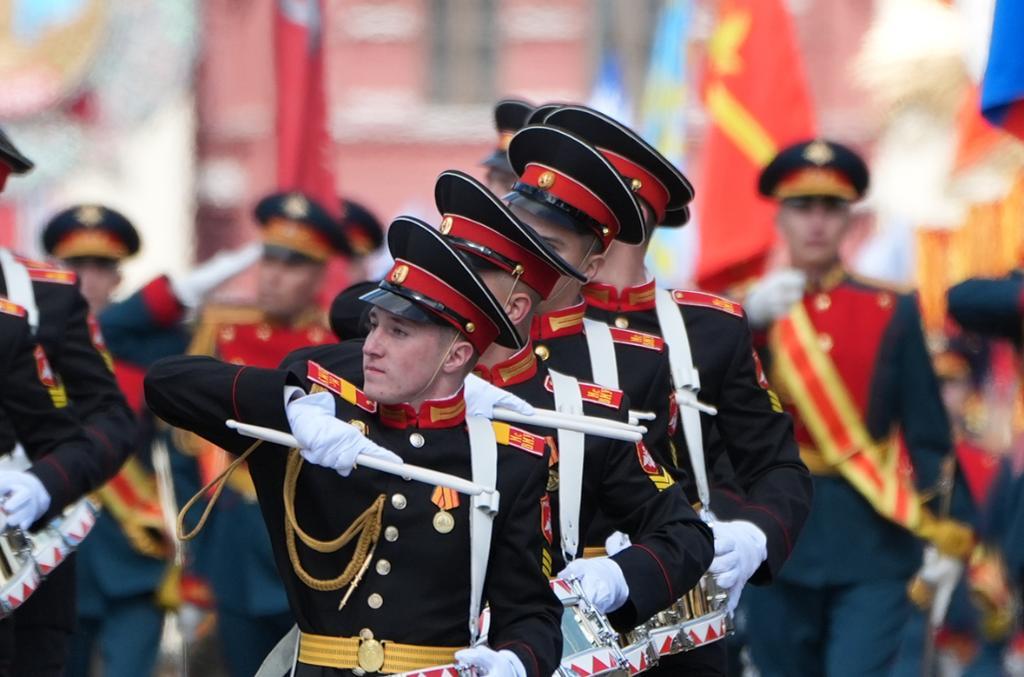 2025年5月9日,在俄羅斯首都莫斯科,軍樂(lè)隊(duì)參加紀(jì)念蘇聯(lián)偉大衛(wèi)國(guó)戰(zhàn)爭(zhēng)勝利80周年閱兵式。新華社記者 賴向東 攝