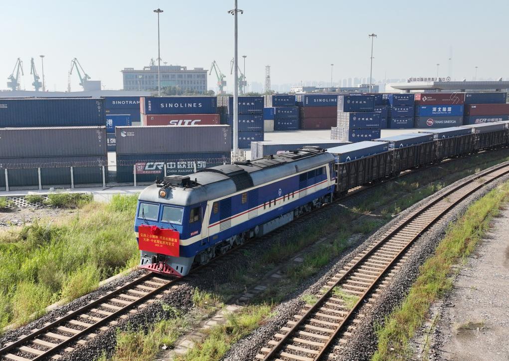2025年10月13日拍攝的天津-中亞圖定班列首發(fā)現(xiàn)場(chǎng)(無(wú)人機(jī)照片)。新華社記者 李然 攝