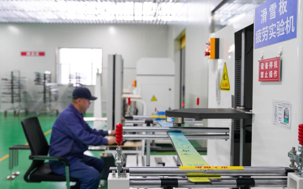 2025年12月4日,在吉林化纖國興復(fù)合材料有限公司的車間內(nèi),工作人員用機(jī)器設(shè)備檢測(cè)公司自主研發(fā)生產(chǎn)的碳纖維滑雪板。新華社記者 顏麟蘊(yùn) 攝