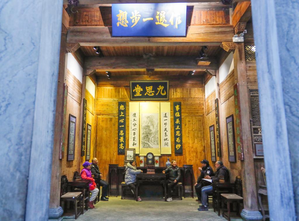 天井下,兩張半圓桌拼成的“和合桌”還留著茶水余溫;古宅門額上,“作退一步想”五個(gè)篆字格外醒目。
