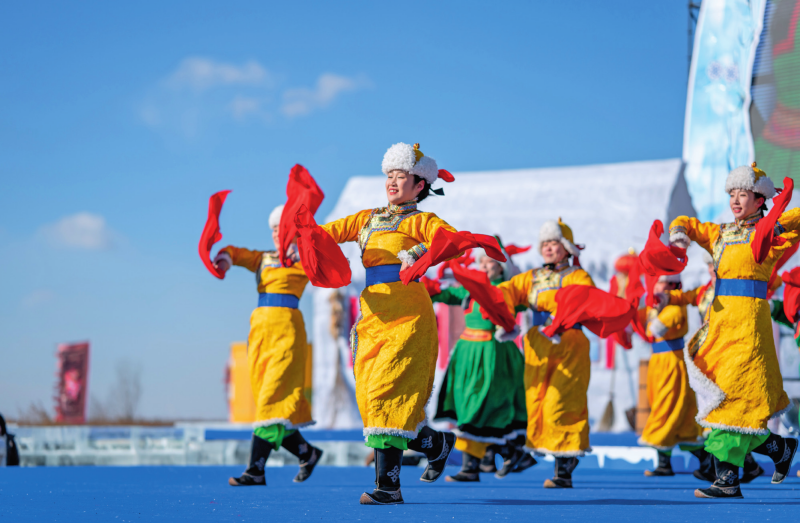 哈素海第四屆冬捕節(jié)暨冰雪旅游系列活動在內(nèi)蒙古呼和浩特市土默特左旗開幕。這是開幕式上的文藝表演(2026年1月10日攝)。連振攝/本刊
