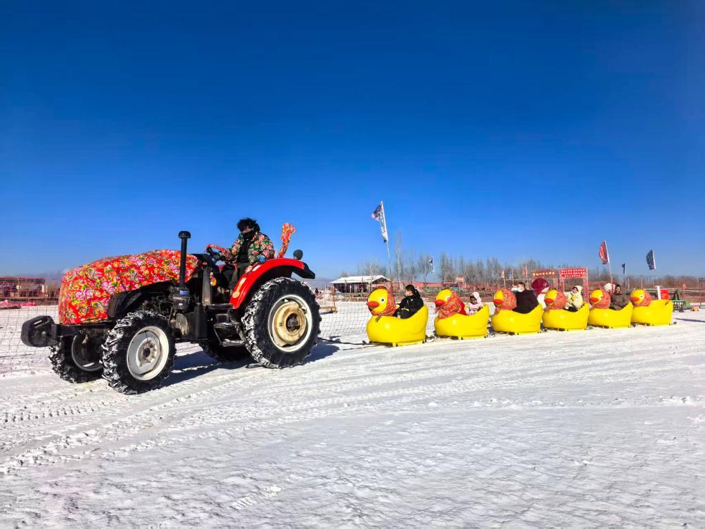 稻漁空間鄉(xiāng)村生態(tài)觀光園里,稻田褪去金黃,化身冰雪樂園。游客坐著雪圈從人造雪坡頂俯沖而下,雪地摩托呼嘯馳過,尖叫聲、歡笑聲此起彼伏。