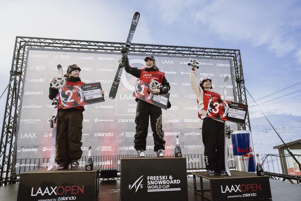 2026年1月17日,在瑞士萊克斯舉行的國際雪聯(lián)世界杯系列賽中獲得女子自由式滑雪坡面障礙技巧冠軍的谷愛凌(中)在領(lǐng)獎(jiǎng)臺上。新華社發(fā)(馬塞爾·萊默希特?cái)z)