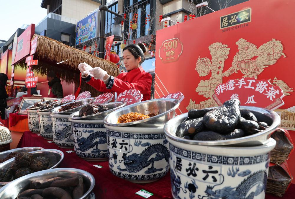 商家在為顧客打包非遺手工醬菜。