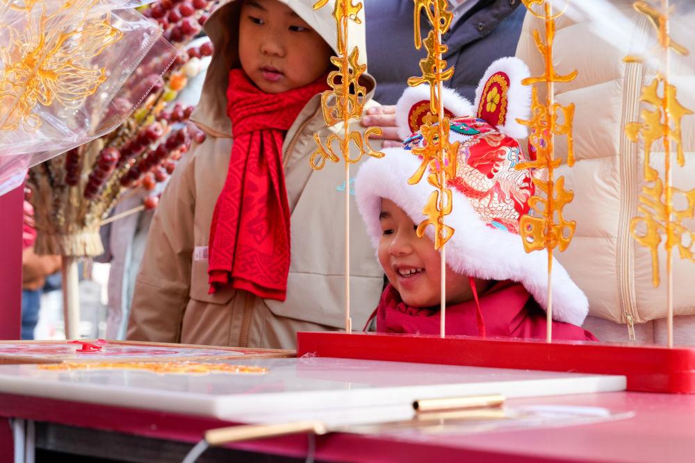 2026年2月7日,小朋友在江蘇南京舉行的“樂購新春 蘇品蘇貨”年貨大集上觀看糖畫制作。