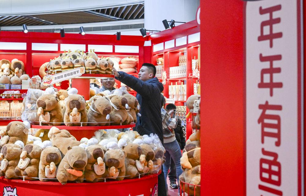 2026年2月7日,市民游客在上海市南京路步行街一家春節(jié)限定潮玩快閃店挑選商品。