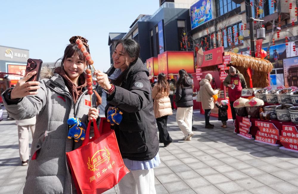 兩位游客在拿著剛購買的糖葫蘆自拍。