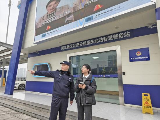 圖為在重慶北站智慧警務(wù)站前,民警正在解答旅客咨詢。