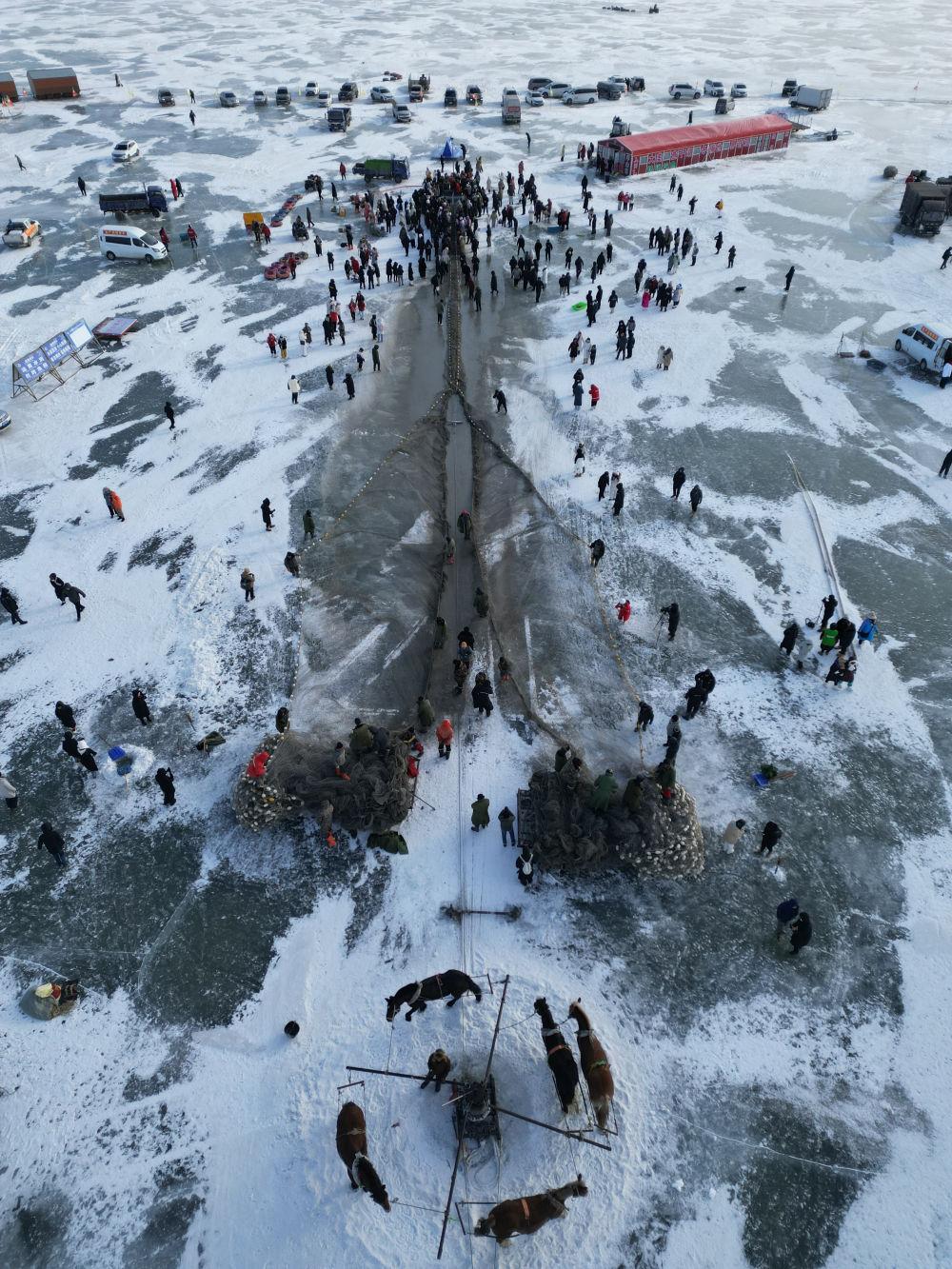 在吉林省松原市,游客在查干湖冰面上觀看冬捕(2026年1月7日攝,無(wú)人機(jī)照片)。新華社記者 顏麟蘊(yùn) 攝