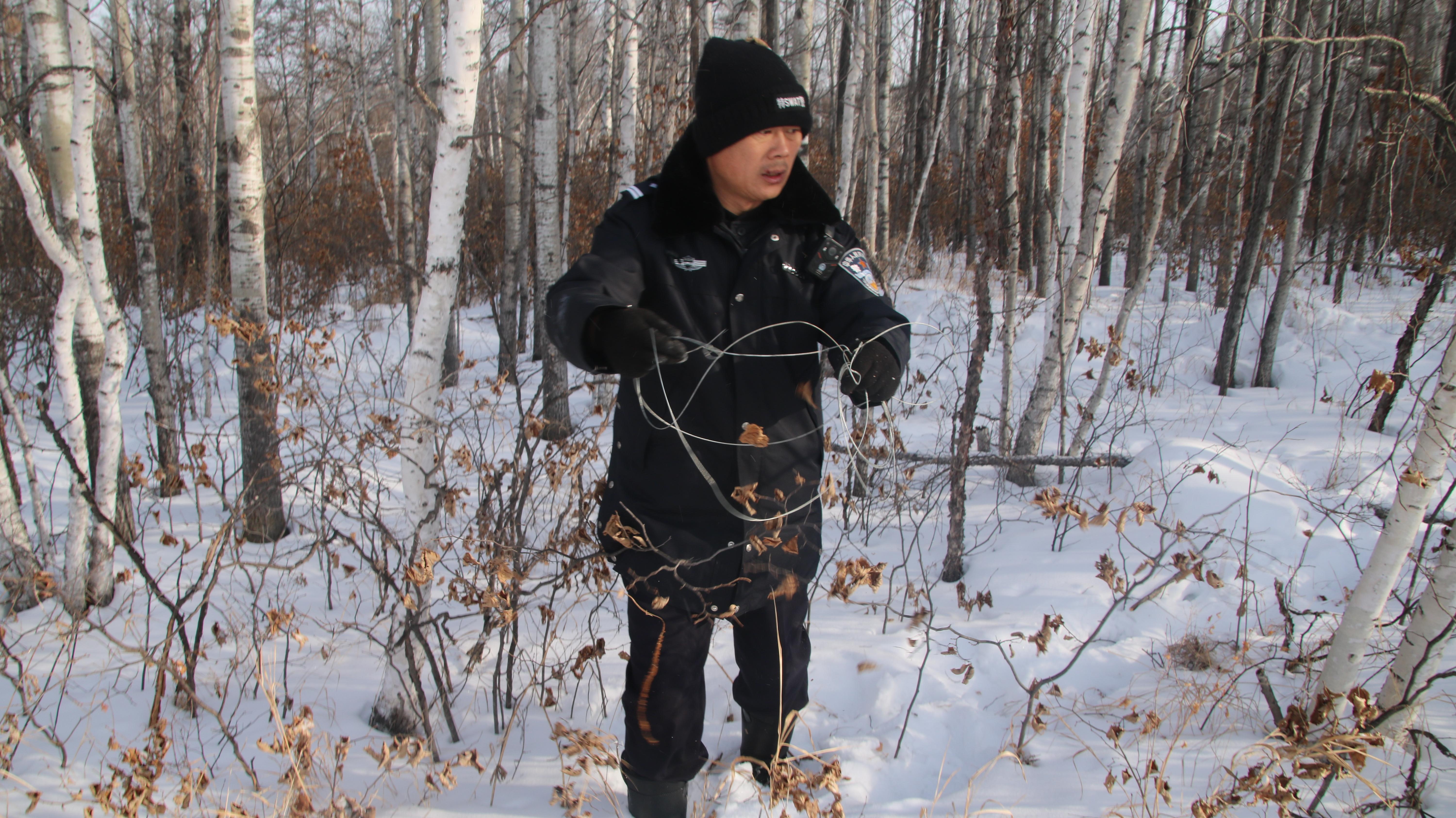 “老鄉(xiāng),過年進山串親戚可留神,別踩著陌生的繩套!那是非法獵套,既傷野生動物,也容易誤著人!”大年初三清晨,內(nèi)蒙古大興安嶺畢拉河林區(qū)的氣溫低至零下30攝氏度,畢拉河分局龍頭派出所教導員王云良呵出的白氣瞬間凝成霜花,他一邊給進山走親的群眾遞上野生動物保護宣傳手冊,一邊反復叮囑著安全注意事項。身旁的民警蘇力得正彎腰檢查著林間一處隱蔽的獸徑,手套上已經(jīng)沾了厚厚的積雪。