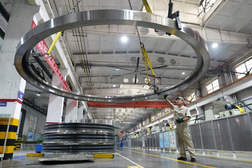 2025年5月22日,工人在洛陽(yáng)軸承集團(tuán)股份有限公司風(fēng)電三車間生產(chǎn)線上作業(yè)。新華社記者 李嘉南 攝