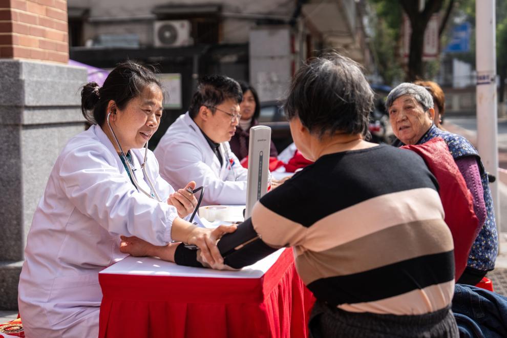 3月5日,在長沙市望城區(qū)高塘嶺街道雷鋒路社區(qū)雷鋒驛站,志愿者(左一)為市民測量血壓。新華社記者 陳思汗 攝