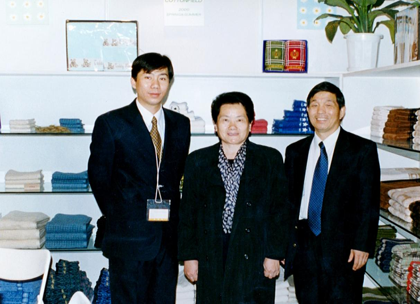 2000年3月北京中國國際紡織品博覽會(huì)上,原中國紡織工業(yè)部部長吳文英(中)、原中國家用紡織品協(xié)會(huì)會(huì)長楊東輝(右)在南華實(shí)業(yè)公司展位前與馬濤(左)合影。展位商品所使用的標(biāo)識(shí)即為“無印良品”。