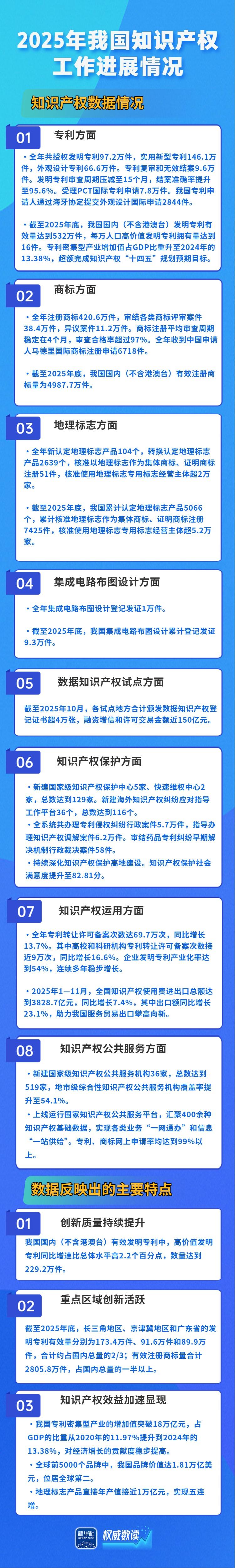發(fā)明專利有效量達532萬件,人工智能專利有效量居全球前列,地理標志產(chǎn)品直接年產(chǎn)值實現(xiàn)五連增……在23日國新辦新聞發(fā)布會上,國家知識產(chǎn)權(quán)局介紹2025年我國知識產(chǎn)權(quán)工作進展情況。跟隨海報,一起來看看吧。