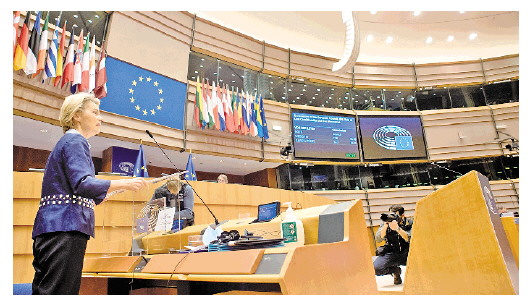 “2021年將是科技巨頭的監(jiān)管年。它們現(xiàn)在已經(jīng)是一個(gè)成熟的行業(yè)了,而不再只是閃閃發(fā)光的年輕創(chuàng)業(yè)公司。”美國(guó)戰(zhàn)略與國(guó)際問(wèn)題研究中心高級(jí)副總裁、技術(shù)政策項(xiàng)目主任詹姆斯·安德魯·劉易斯評(píng)論說(shuō):“我們過(guò)去常說(shuō),銀行‘大而不能倒’,但銀行其實(shí)受到高度監(jiān)管?,F(xiàn)在,對(duì)這些科技巨頭的監(jiān)管也應(yīng)朝著這個(gè)方向發(fā)展?!?br/> 歐盟今年2月啟動(dòng)《數(shù)字服務(wù)法案》和《數(shù)字市場(chǎng)法案》立法工作。歐盟領(lǐng)導(dǎo)人就此進(jìn)行了數(shù)輪磋商。12月15日,歐盟委員會(huì)公布了《數(shù)字服務(wù)法案》及《數(shù)字市場(chǎng)法案》草案。圖①為歐盟委員會(huì)領(lǐng)導(dǎo)人及法、德等歐洲主要國(guó)家領(lǐng)導(dǎo)人在布魯塞爾進(jìn)行磋商。圖②為歐盟委員會(huì)主席馮德萊恩。