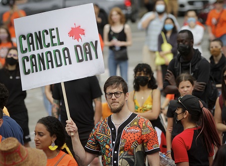 7月1日,抗議者身穿原住民文化圖案的襯衫在加拿大溫哥華參加集會,要求取消加拿大日的慶祝。