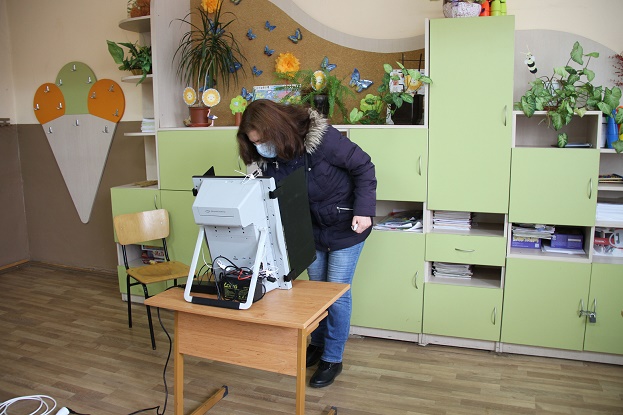 11月14日,選民在保加利亞索非亞一處投票站用電子投票機(jī)投票。