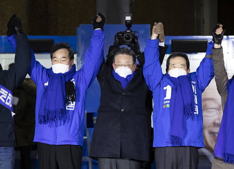 2月15日,候選人李在明(中)在韓國首爾參加競選活動。