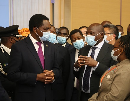 5月31日,贊比亞總統(tǒng)希奇萊馬(前左)在盧薩卡參觀贊比亞國際會議中心。