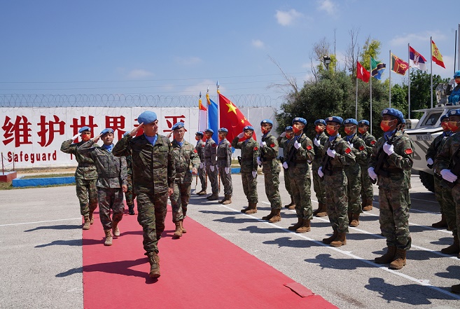 8月3日,在黎巴嫩南部省提爾市的中國維和部隊營地,聯(lián)合國駐黎巴嫩臨時部隊司令拉薩羅少將(左前)檢閱中國維和部隊。