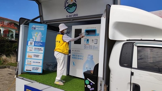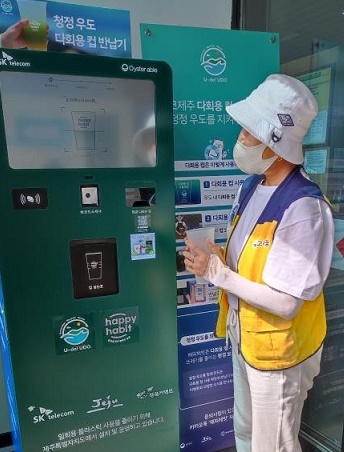 一般游客在進(jìn)入牛島前,可以在碼頭等處掃碼,簽署支持牛島資源循環(huán)運動的聲明。游客用完島上餐飲商鋪提供的可重復(fù)使用塑料杯后,可將其放入回收設(shè)備,回收后的杯子經(jīng)過清洗、消毒等流程后將被重復(fù)利用。為鼓勵游客積極參與,回收終端提供積分、現(xiàn)金返還和交通卡充值等形式的獎勵。此外,對于沒有用完的塑料杯,游客可以帶出牛島,在濟(jì)州島主要交通設(shè)施、指定咖啡店等處利用回收設(shè)備進(jìn)行回收。