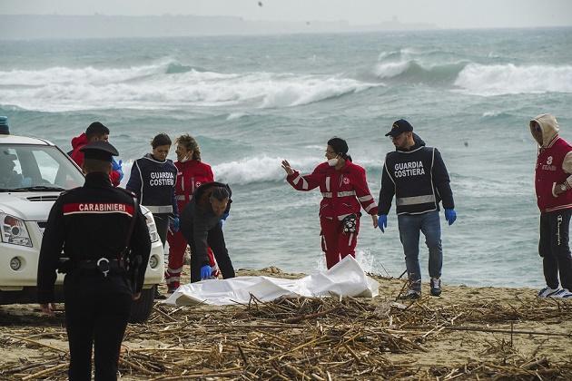 圖為26日,在意大利南部卡拉布里亞大區(qū)庫(kù)特羅附近,紅十字會(huì)志愿者和海岸警察發(fā)現(xiàn)一具移民船沉船事故遇難者遺體。新華社/美聯(lián)