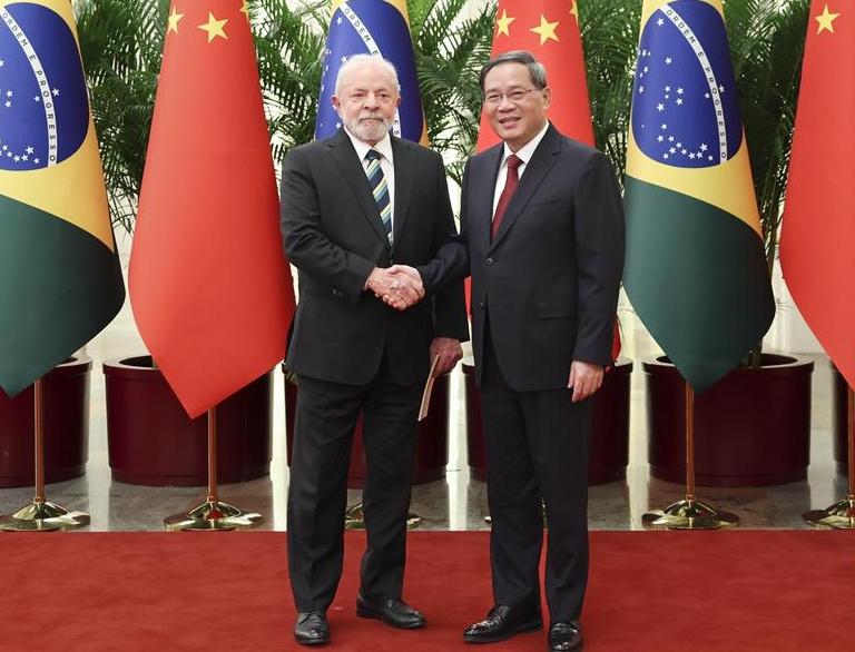 4月14日,國務(wù)院總理李強(qiáng)在北京人民大會(huì)堂會(huì)見來華進(jìn)行國事訪問的巴西總統(tǒng)盧拉。新華社記者 丁海濤 攝