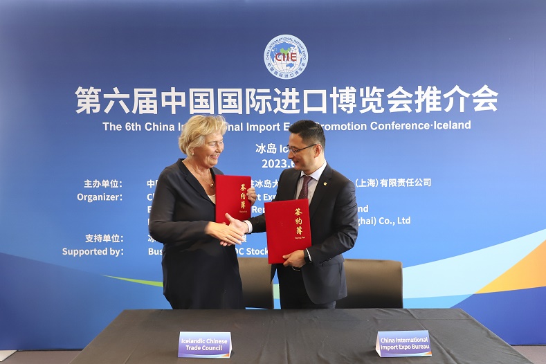 16日,在冰島雷克雅未克,冰中貿(mào)促會主席約尼娜·比亞特馬斯與中國國際進口博覽局簽署合作備忘錄。新華社記者 陳靜 攝