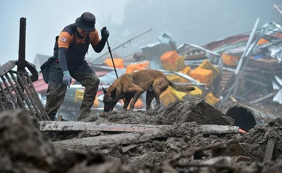 16日,在韓國(guó)慶尚北道醴泉郡,救援人員在因暴雨引發(fā)山體滑坡的村莊內(nèi)搜救。新華社/紐西斯通訊社