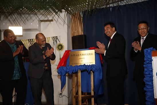 圖為29日,中國政府代表、國家國際發(fā)展合作署署長羅照輝和瑙魯外長安格明共同為使館揭牌。 新華社發(fā)(陳國龍 攝)