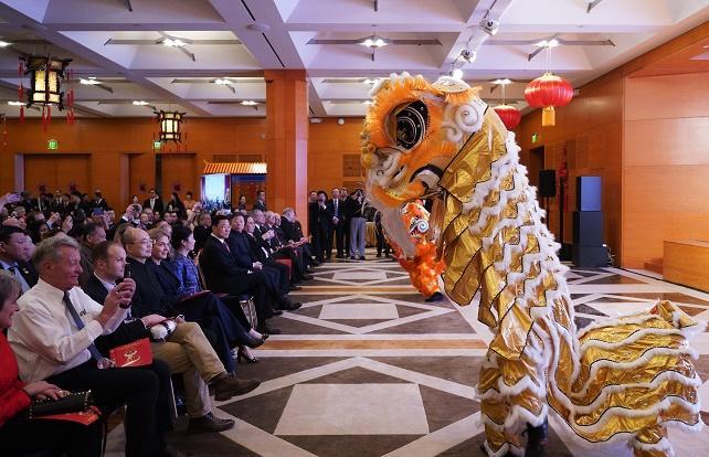 1月24日,在美國首都華盛頓舉辦的新春招待會上,來賓觀看舞獅表演。新華社記者 吳曉凌 攝