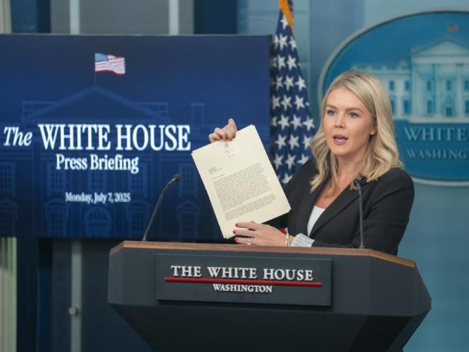 7月7日,在美國首都華盛頓白宮,白宮新聞發(fā)言人卡羅琳·萊維特在記者會上展示美國總統(tǒng)特朗普致日本首相的信函。新華社記者胡友松攝