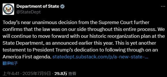 美國國務(wù)院當天在社交媒體上發(fā)文說:“我們將繼續(xù)推進國務(wù)院的歷史性重組工作?!?/p>