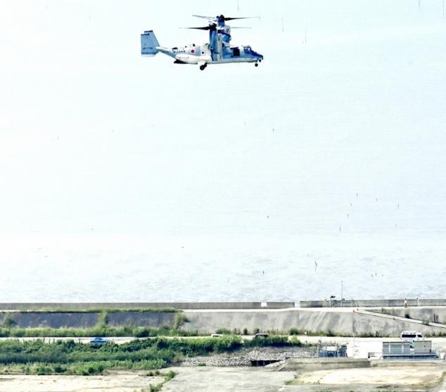 圖為當(dāng)?shù)貢r間2025年7月9日,日本佐賀市,一架日本陸上自衛(wèi)隊V-22“魚鷹”運(yùn)輸機(jī)抵達(dá)陸上自衛(wèi)隊新啟用的佐賀駐地。 CFP供圖