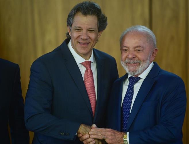 8月13日,在巴西首都巴西利亞舉行的“巴西主權(quán)計(jì)劃”啟動(dòng)儀式上,巴西總統(tǒng)盧拉(右)和巴西財(cái)政部長(zhǎng)費(fèi)爾南多·阿達(dá)握手。新華社發(fā)(盧西奧·塔沃拉攝)