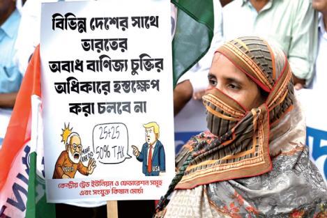 圖為8月13日,印度加爾各答,印度中央工會(huì)組織成員舉行抗議集會(huì),反對美國政府對印度商品征收50%的關(guān)稅。 CFP供圖