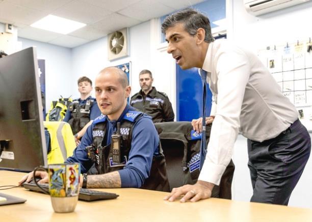 當(dāng)?shù)貢r(shí)間2024年4月10日,英國(guó)蘇塞克斯郡,時(shí)任英國(guó)首相蘇納克在霍舍姆警察局觀看監(jiān)控錄像,表示政府將遏制商店盜竊犯罪。 CFP供圖